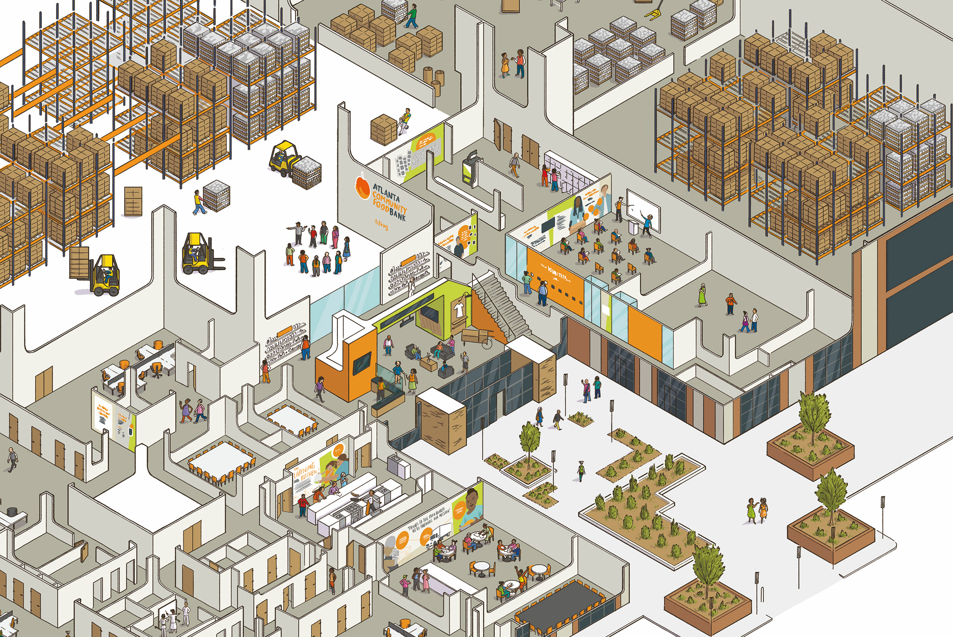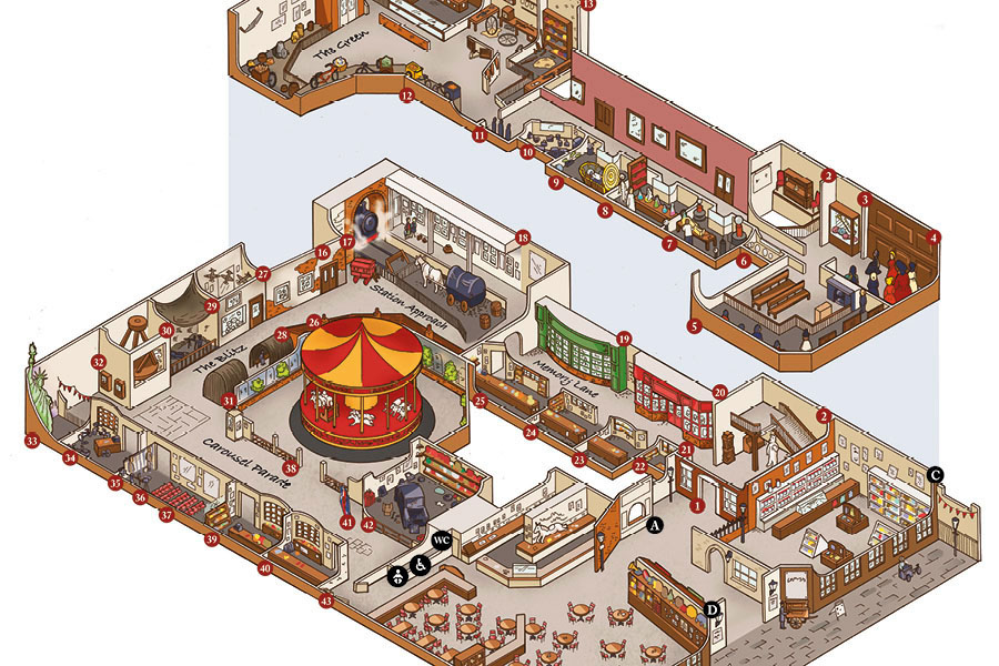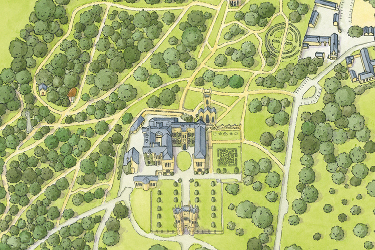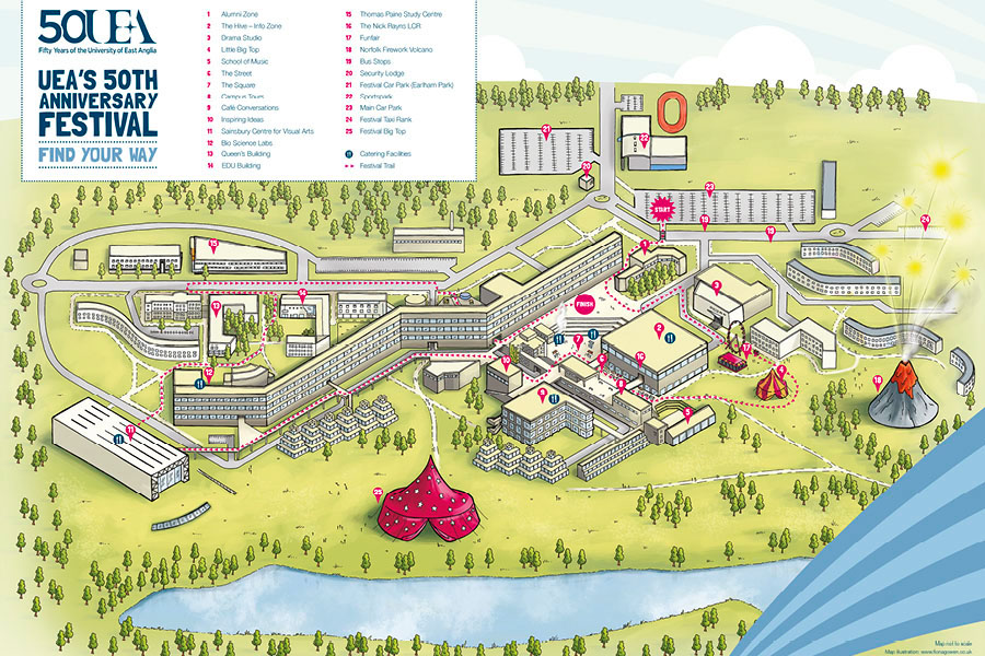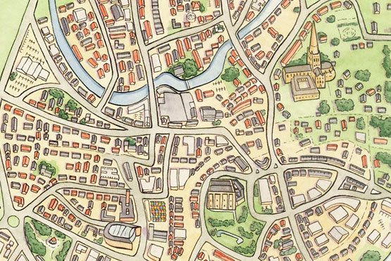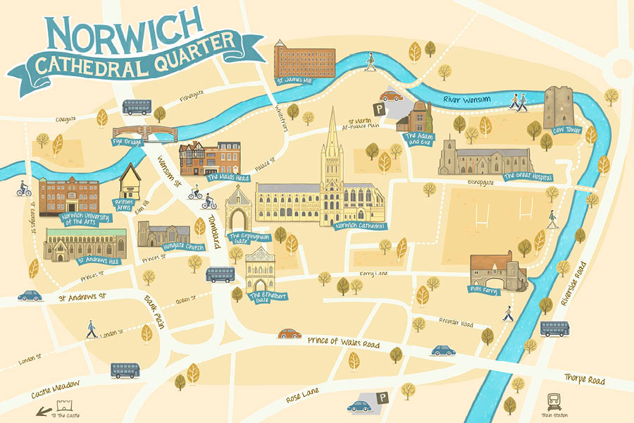 Hand-drawn, Illustrated Map of the Golden Triangle, Norwich. Pen and Ink with digital colouring.
